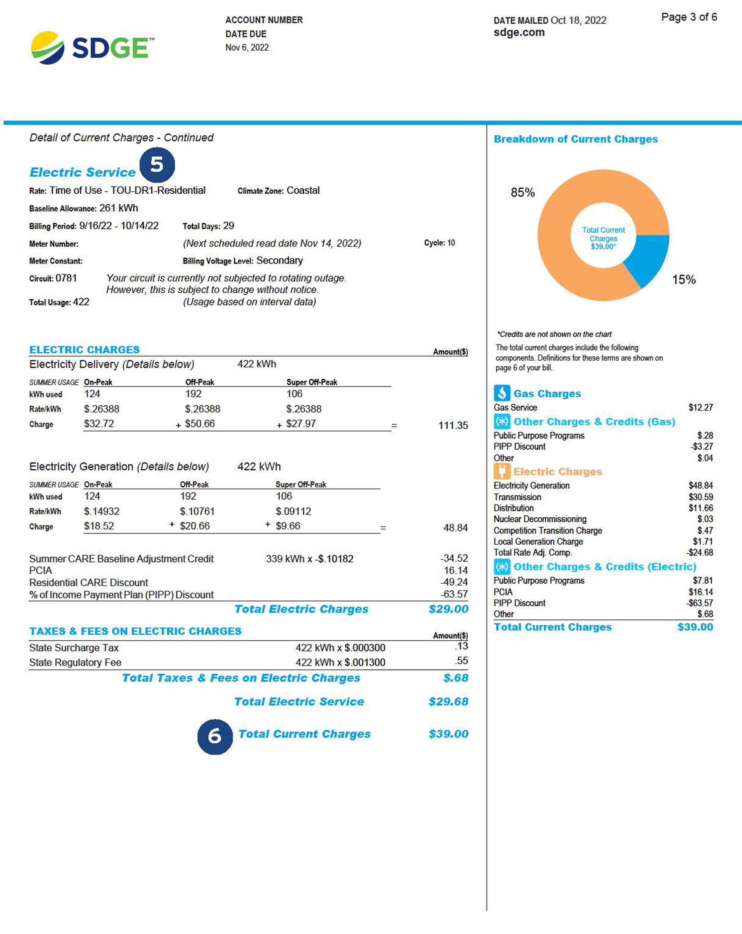 6. Total Current Charges is the total amount due for gas and electric service, including taxes & fees, in the current billing period; amount does not include past due charges.